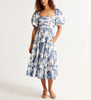 Flattering short-sleeve midi dress in our classic poplin fabric, featuring on-trend puff sleeves, ruching details along the bodice, tiered skirt with pockets and square neckline.