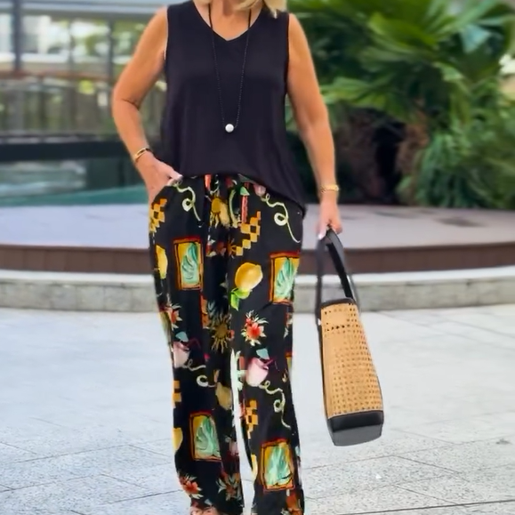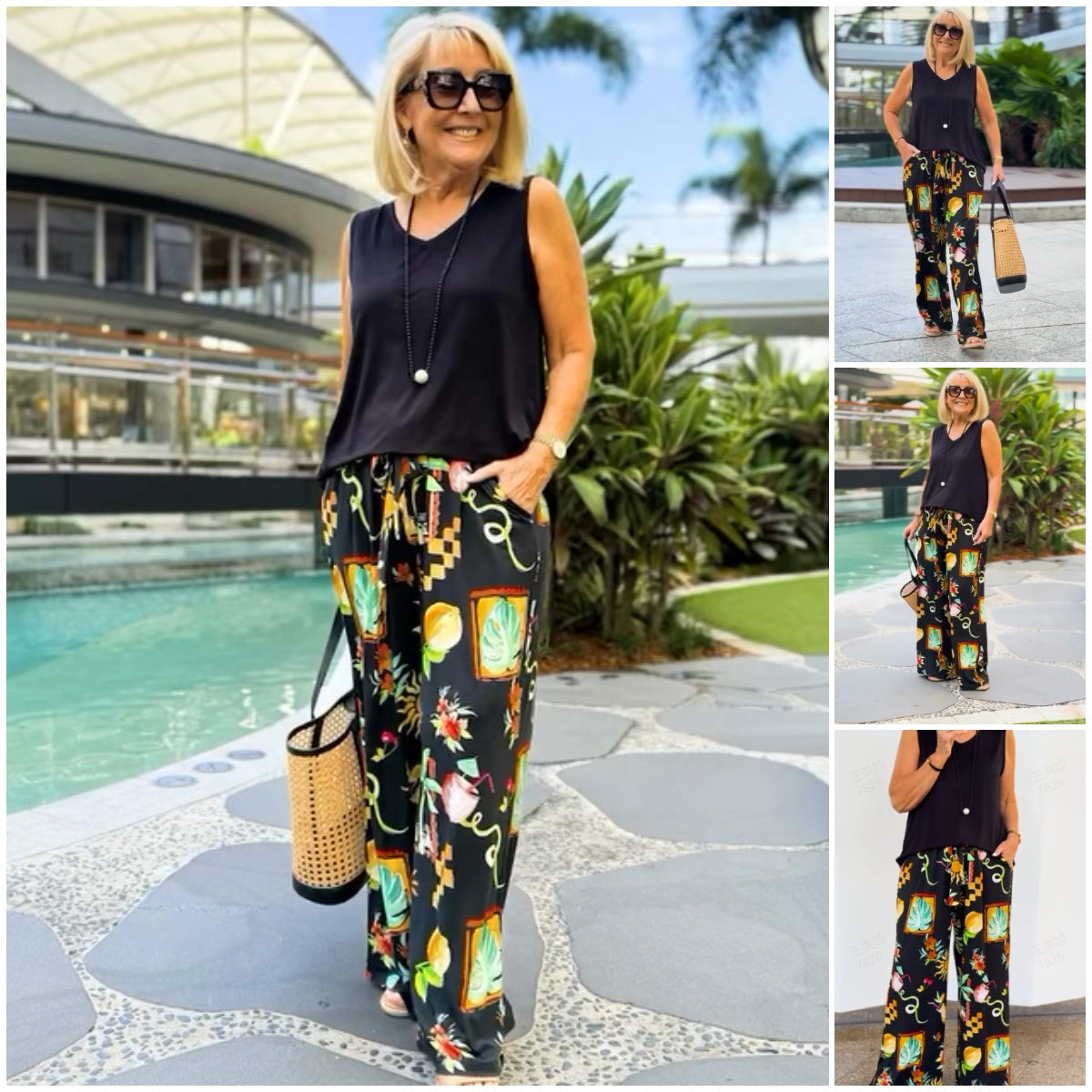 ELEGANT AND TRENDY DESIGN: This chic 2-piece set features a sleeveless top paired with stylish printed wide-leg pants, perfect for an effortless yet fashionable look.