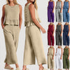 Adorable summer 2-piece sets featuring a sleeveless scoop neck ruffle crop top with back button, wide elastic high waist leg over ankle pants with pocket.